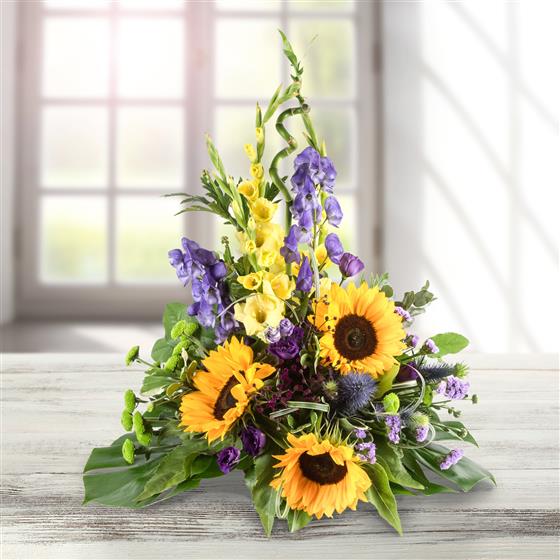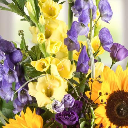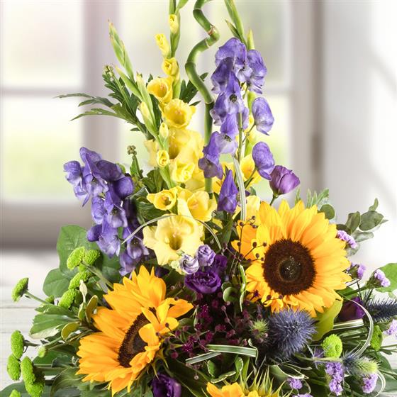 A magnificent arrangement of bright yellow sunflowers, gladioli, aconitum and lime green chrysanthemums.